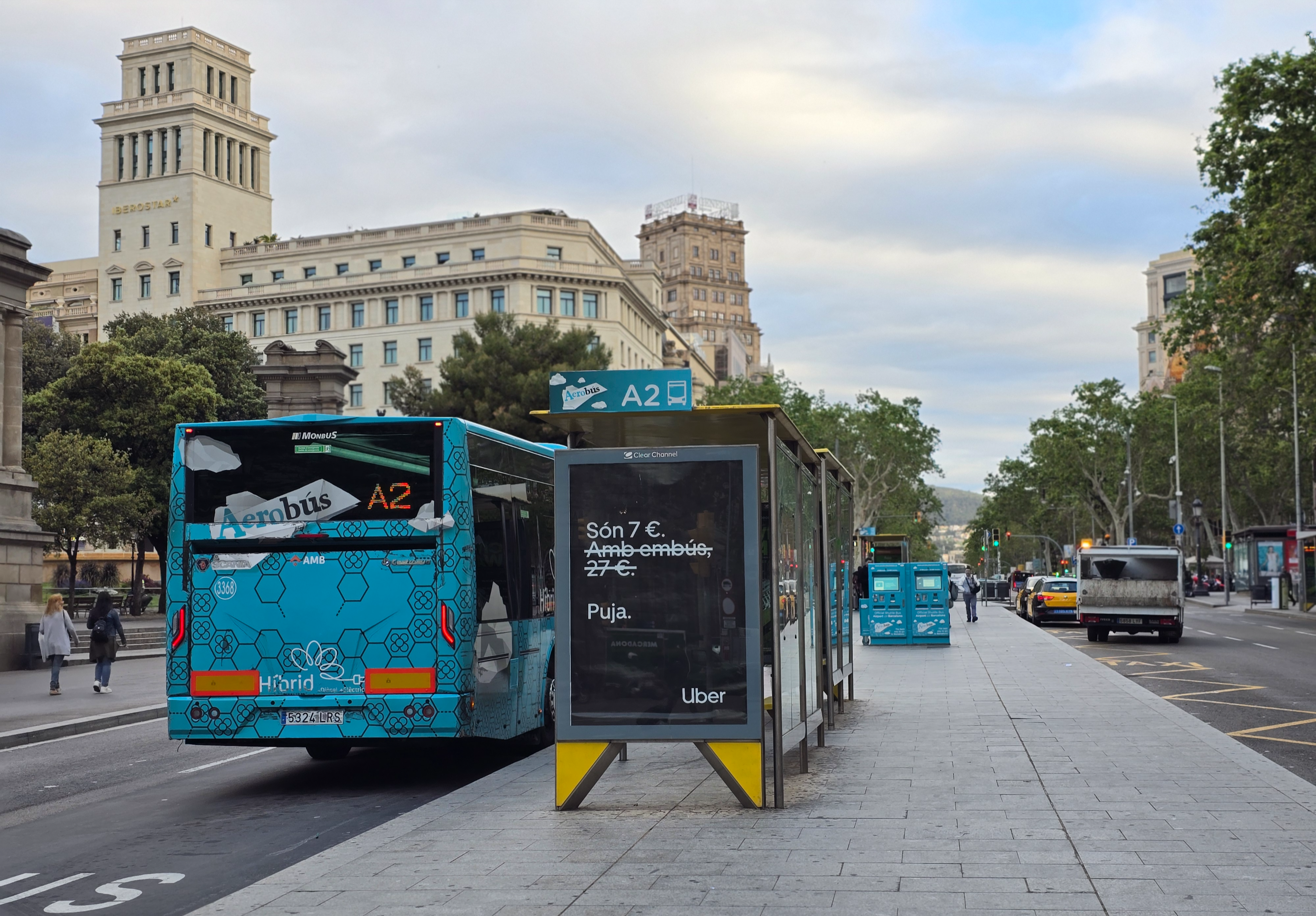 까딸루냐 광장 앞의 공항버스 타는 곳입니다. 첫날 샀던 왕복표를 이용하여 탑승합니다. 사진에는 A2 만 보이는데 저 앞에 매표기 쪽에 A1도 있어요. 부엘링은 A1이라 앞으로 이동하여 버스에 탑승합니다. 거의 상주하다시피 해서 기다리는 시간도 거의 없어요.