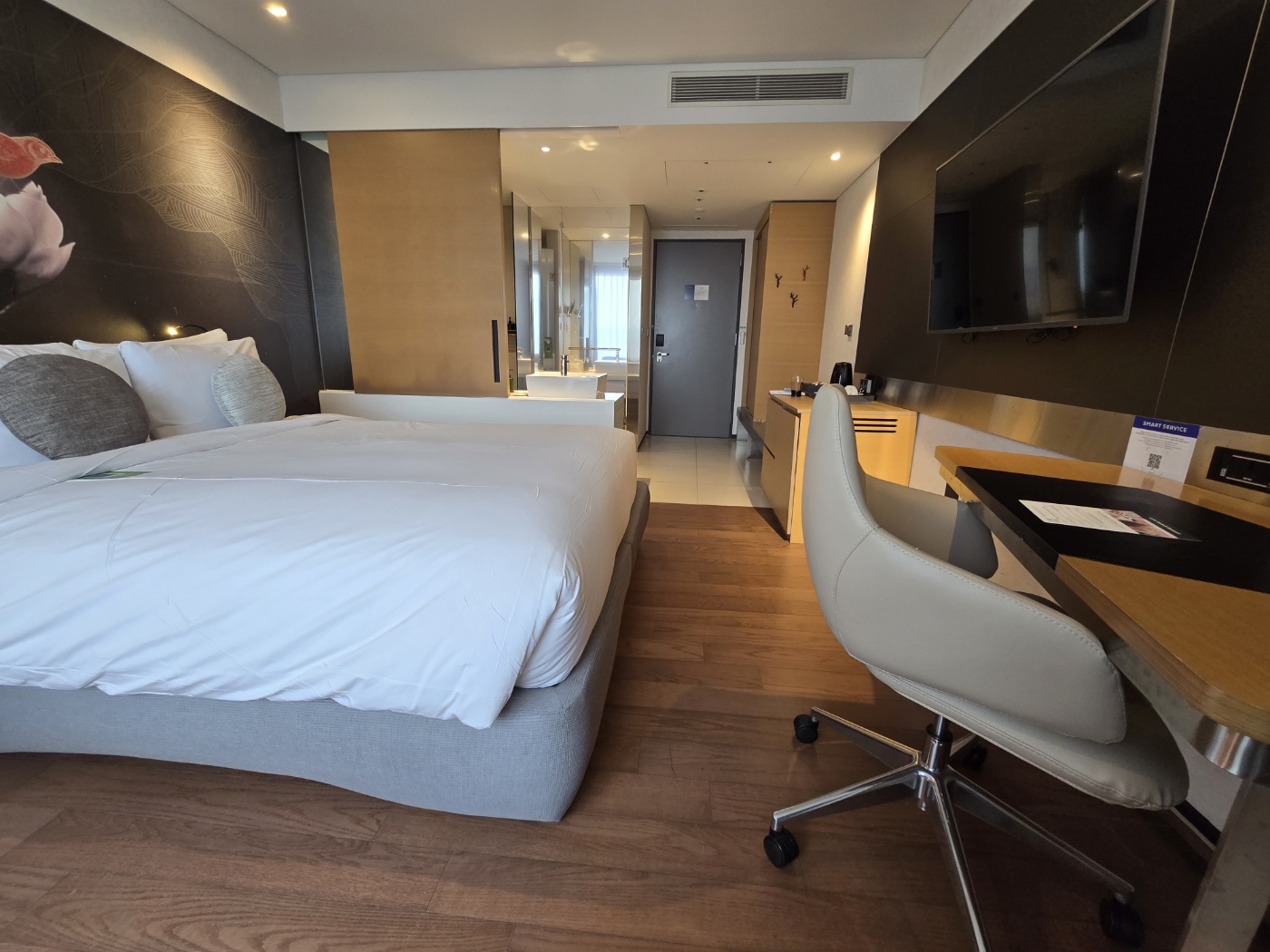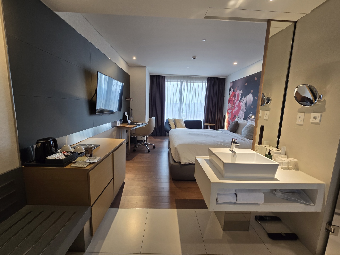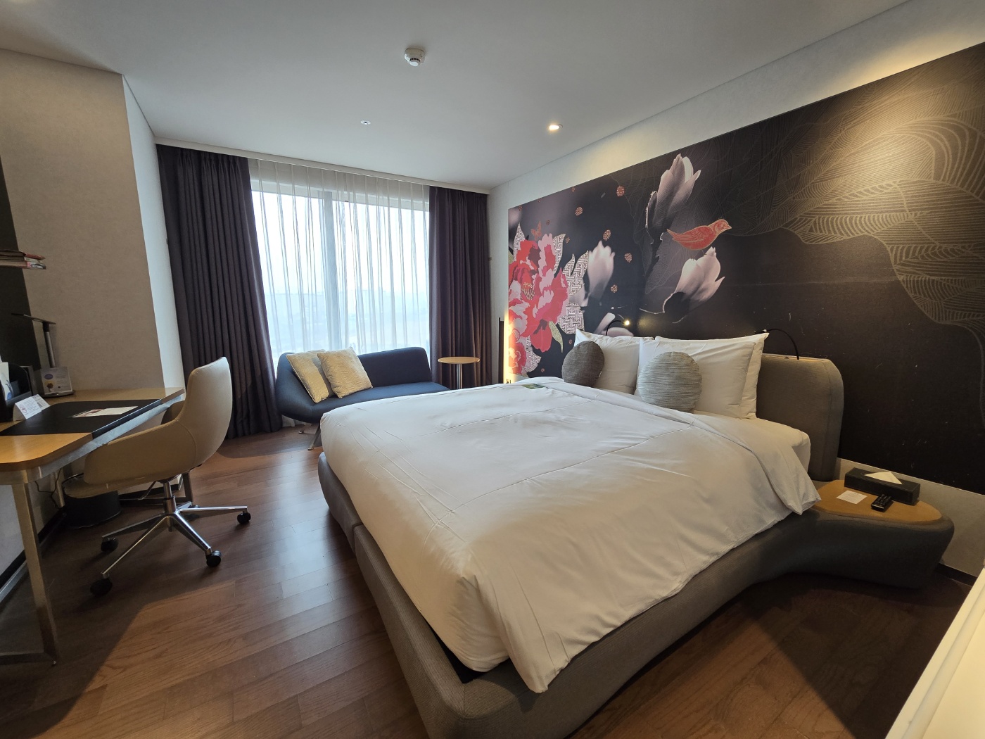 내부는 매우 마음에 드는 디자인이었습니다. 후기 보면서 여러 룸 타입을 봤는데 여긴 심플하면서도 뭔가 동양적인 느낌이 가득해요. 커다란 침대와 소파, 책상과 의자 탁자 등이 있어서 필요한 건 다 갖추고 있다는 걸 알 수 있고요.