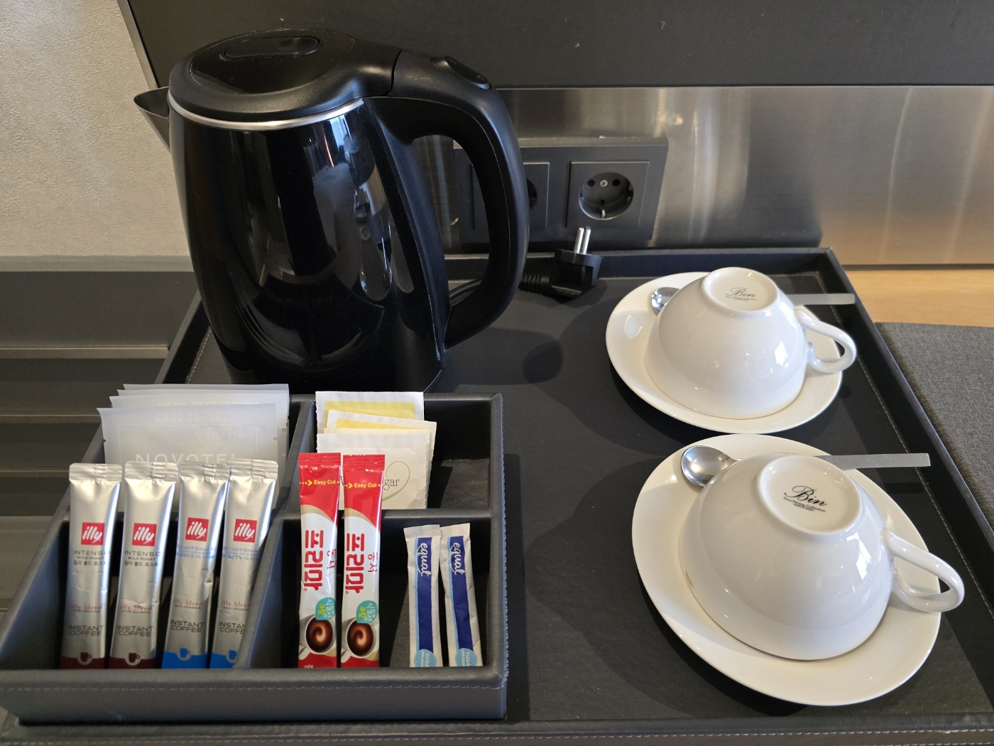 작은 미니 냉장고와 함께 내부에 있던 커피와 차, 여러 컵들이에요. 일리커피 마셔봤는데 괜찮았어요. 냉장고는 냉동기능은 거의 무쓸모라 아이스크림이 다 녹아버렸던 아쉬움이 ㅎㅎㅎ 뭐 이건 어디든 그렇긴 하죠.