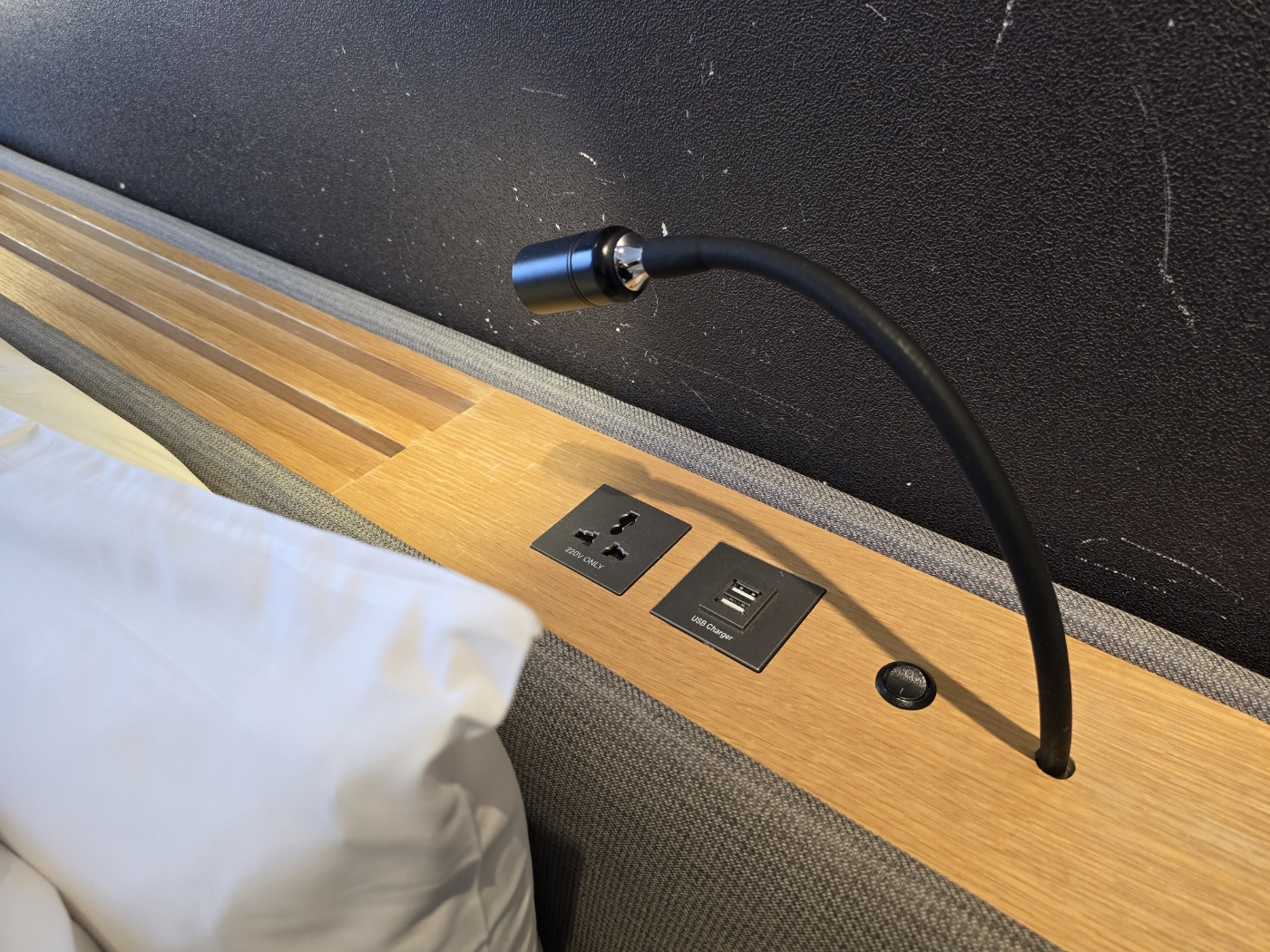 요기 충전할 수 있는 것도 있고요. 침대 옆에 무드등 겸 독서등으로 아주 잘 써먹은 등도 깔끔심플하게 마련되어 있습니다.