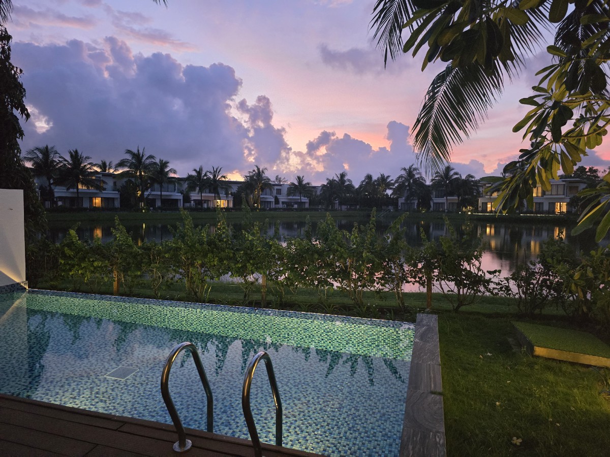 혼자 물에 떠 있는 걸 좋아해서 풀빌라를 선호하는 편인데 여기 진짜 딱 알맞았어요. 1.2m라 깊이도 좋고 생각보다 넓어서 저 혼자 휘휘 다니기도 좋더라고요. 밤에 노을과 함께 조명이 켜지니까 더 예쁘죠. 프라이빗하긴 한데 직원들이 청소하러 호수 사이를 지나다닙니다. 생각보다 자주 왔다갔다하기 때문에 신경쓰이는 분들은 체크하셔야 할 것 같네요. 그리고 여기서는 양 옆의 투숙객 소리가 잘 들립니다. 애기들이 아주 신났더라고요 ㅋㅋ