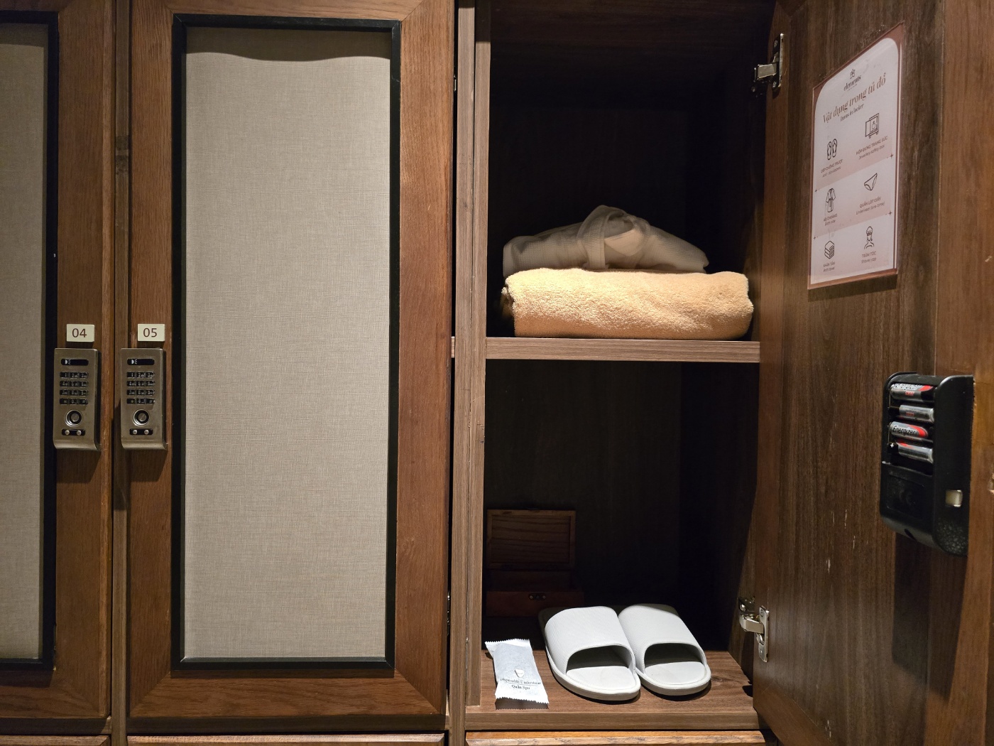 전담 마사지사의 안내에 따라 락커로 이동합니다. 내부에는 수건, 1회용 팬티, 슬리퍼, 귀중품 보관함 등이있고요. 비밀번호를 설정하면 향후 그 번호를 눌러서 열 수 있습니다.