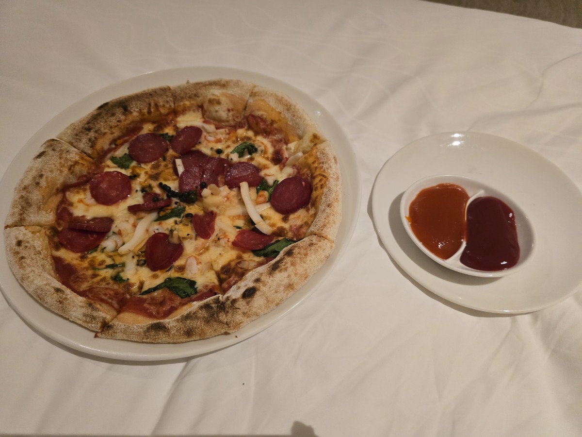 어플로 시킬 수 있는 룸서비스가 있습니다. 사진은 초리조 피자지만 추천하고 싶은 건 갈릭쉬림프에요. 진짜 맛있더라고요. 피자는 맛있긴 한데 엄청 강추까지는 아닙니당. 대신 어플로 시킨다는 장점이 매우만족이었어요. 심지어 오래 걸리지도 않더라고요.
