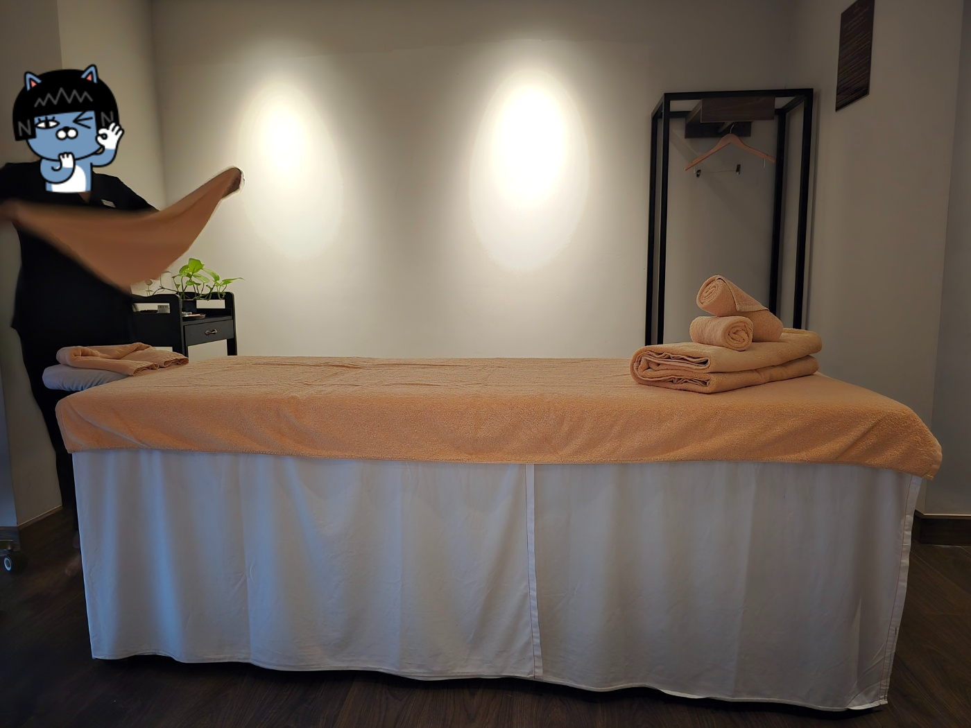 전담 마사지사 언니의 얼굴은 보호합니다. ㅎㅎ 내부는 이런 느낌인데 상당히 넓어요. 시설 깔끔하고 음악도 편안합니다. 청결도 매우 만족했고요. 대신 발을 닦아 줄 때 라임이나 이런 건 없이 물로만 합니다. 이때만 해도 응, 시내 마사지가 더 서비스 좋은 거 아냐? 했었지요.